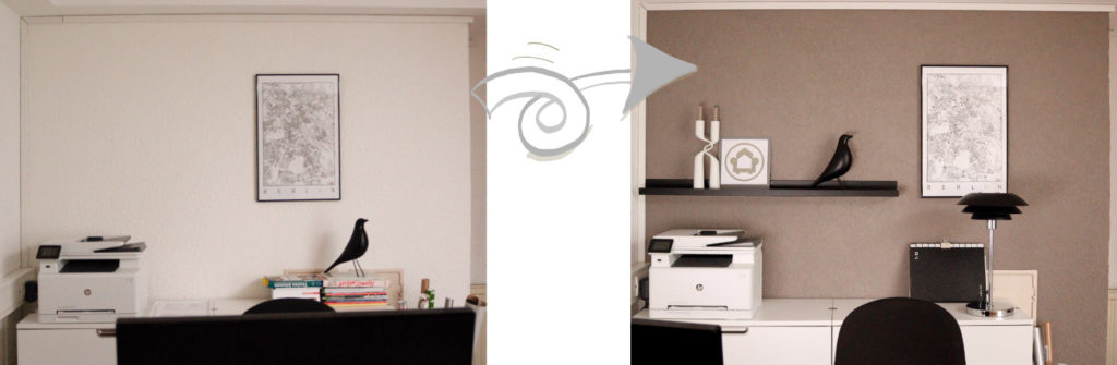 Und vollgestopfte Wände lenken ab. Ich habe meine Wand tatsächlich vorher gezeichnet und auf der vorhandenen Fläche Bilder, Regale, Leuchten hin- und hergeschoben. Das ist nicht schwer, das kannst du auch, denn: es geht ja nur um diesen einen Ausschnitt. Wenn du selbst Unternehmer*in bist, dann integriere doch dein Logo in die Dekoration. Ganz nebenbei stärkst du damit dein Corporate Design.